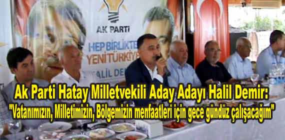 Ak Parti Hatay Milletvekili Aday Adayı Halil Demir: "Vatanımızın, Milletimizin, Bölgemizin menfaatleri için gece gündüz çalışacağım"Ak Parti Hatay Milletvekili Aday Adayı Halil Demir: "Vatanımızın, Milletimizin, Bölgemizin menfaatleri için gece gündüz çalışacağım" Ak parti Hatay Milletvekili Aday Adayı Halil Demir, 08.09.2015 Salı günü saat 09:30'da İskele Kafe’de kahvaltılı basın toplantısı düzenledi. Düzenlenen toplantıya çok sayıda Ak partili üyeler ve basın mensupları katıldı. 1 Kasım Erken Genel Seçim çalışmaları kapsamında çalışma arkadaşları ile beraber bir araya gelen Hatay Milletvekili aday adayı Halil Demir Basın toplantısında açıklamada bulunarak şöyle konuştu : "Ak Partimizin kuruluşundan bu güne kadar partimizin değişik kademelerinde görev yapan değerli arkadaşlarım; saygı değer basın mensupları... Basın açıklamama başlarken, terör olaylarında şehit düşen emniyet mensuplarımıza ve silahlı kuvvetler mensuplarımıza Allah'tan rahmet diler, yakınlarına sabırlar temenni ederim. Siz değerli arkadaşlarımı ve basın mensuplarımızı 1 Kasım 2015 Erken Genel Seçimlerinde Ak Partiden milletvekili aday adayı olmam münasebetiyle buraya davet ettim. Davetime icabet ettiniz, beni onurlandırdınız. Hoş geldiniz sefalar getirdiniz. Biliyorsunuz ki,7 Haziran 2015 tarihindeki genel seçimlerde de Ak partiden milletvekili aday adayı olmuştum. O zaman kısmet olmamıştı. O zaman da söylemiştim, şimdi de aday adaylığımdan dolayı söylüyorum, İskenderun bölgemizde milletvekilimizin mutlaka yenilenmesi lazımdır.