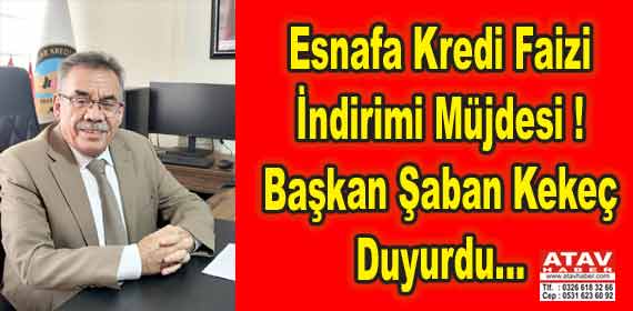 Esnafa Kredi Faizi İndirimi Müjdesi ! Başkan Şaban Kekeç Duyurdu...Esnafa Kredi Faizi İndirimi Müjdesi ! Başkan Şaban Kekeç Duyurdu... İskenderun 1 Nolu Esnaf Kredi Kefalet Kooperatifi Başkanı Şaban Kekeç, 2026 yılının ilk gününde esnafların kooperatiften kullandığı kredilerde faiz oranının düştüğünü açıkladı. Sosyal medya hesaplarından açıklama yapan Başkan Şaban Kekeç, Sıkıntılarla boğuşan esnafların düşük faizli krediye ulaşmalarını kolaylaştırmak için de çalışma yaptıklarını söyledi. Başkan Şaban Kekeç'in Sosyal medya hesaplarından yaptığı açıklama şöyle; "Kooperatiflerimiz kefaleti ile esnaf ve sanatkarlara 05.01.2026 tarihinden itibaren yapılacak Hazine faiz destekli işletme ve yatırım kredisi kullandırımlarında esnafa yansıyan yıllık faiz oranı %20 (aylık %1.66) olarak uygulanacaktır.Esnaf ve Sanatkarlarımıza hayırlı olsun. S.S 1 Nolu Esnaf ve Sanatkarlar Kredi Kefalet Kooperatifi Başkanı Şaban KEKEÇ Adres: Mete Aslan Bulvarı İskenderun Plaza A blok Kat:3 No :14 (Vakıfbank ve Ardon soğutma üstü ) İletişim: 0326 613 19 25 "